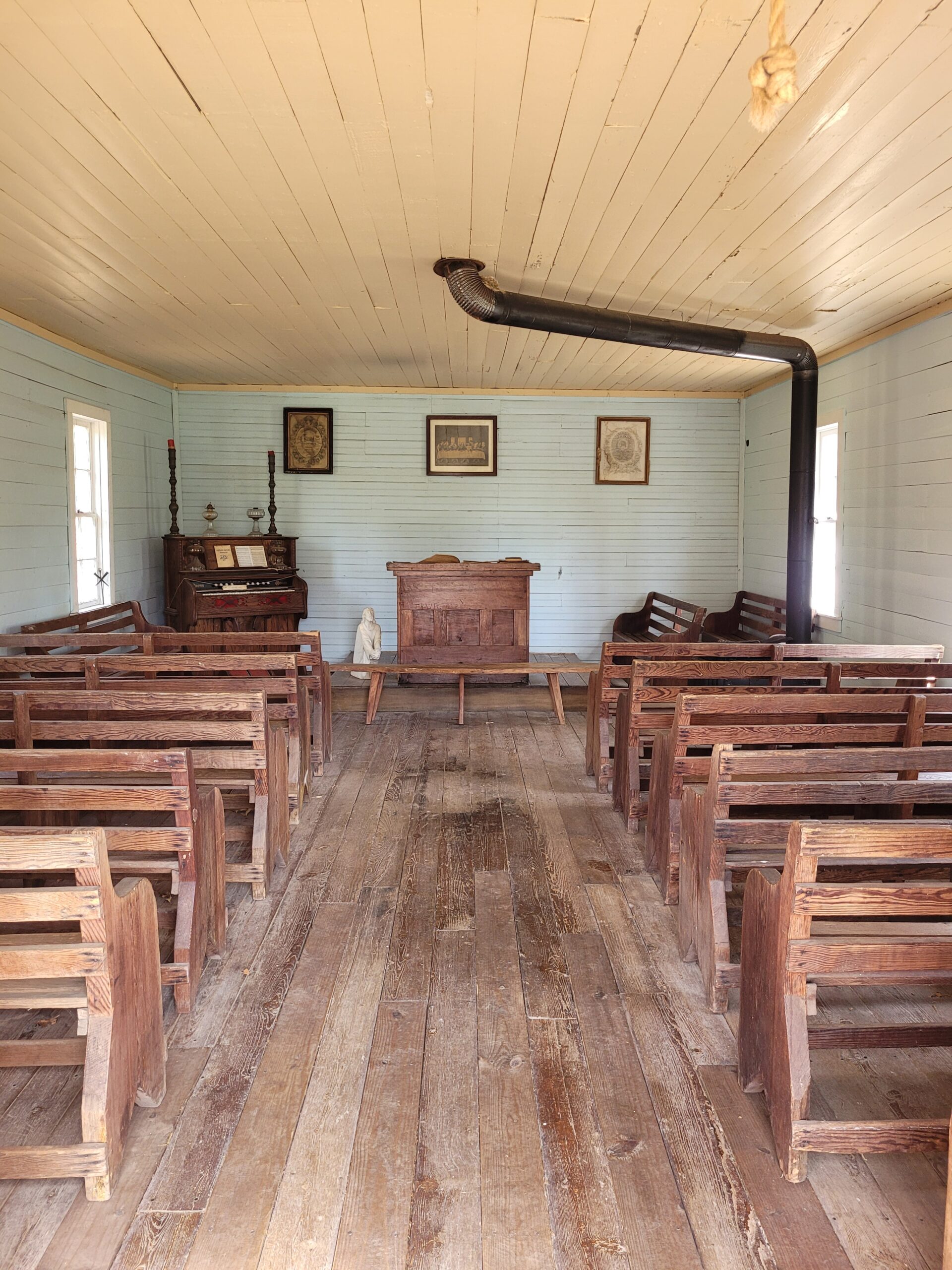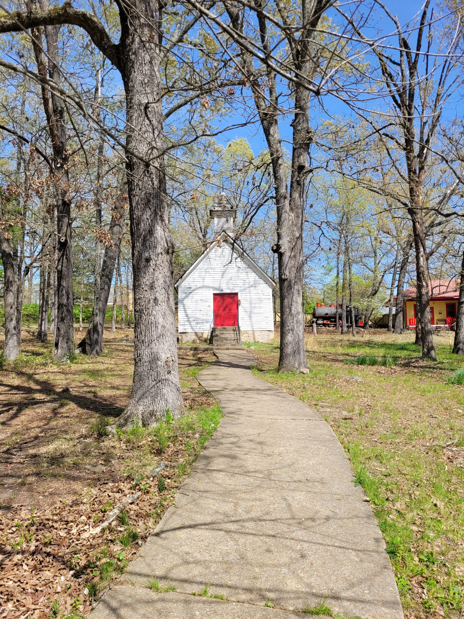 More traditional historic church setting (part of a recreated Ozark pioneer village). This church was built in 1888 at Blue Eye, Missouri, on the Arkansas/Missouri state line.